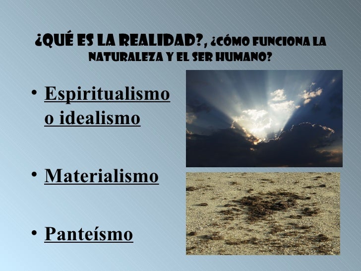 9. ¿Qué es la realidad?, ¿Cómo funciona la naturaleza y el ser humano?• Espiritualismo o idealismo• Materialismo• Panteísmo