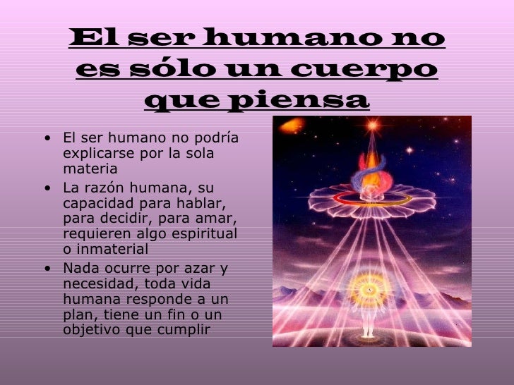 13. El ser humano no es sólo un cuerpo que piensa• El ser humano no podría explicarse por la sola materia• La razón humana, su capacidad para hablar, para decidir, para amar, requieren algo espiritual o inmaterial• Nada ocurre por azar y necesidad, toda vida humana responde a un plan, tiene un fin o un objetivo que cumplir