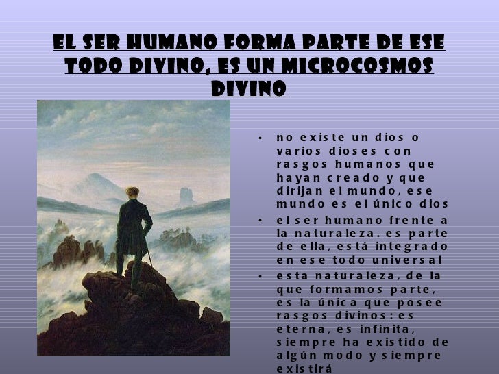 16. El ser humano forma parte de ese Todo divino, es un microcosmos divino • no existe un dios o varios dioses con rasgos humanos que hayan creado y que dirijan el mundo