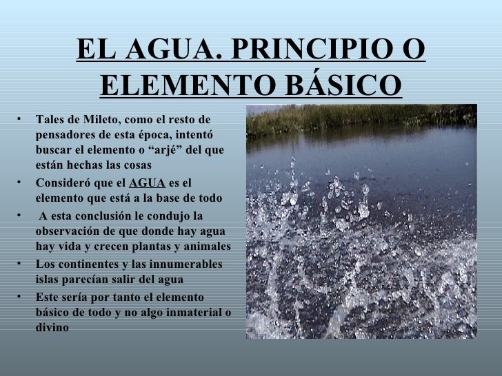 18.EL AGUA. PRINCIPIO O ELEMENTO BÁSICO• Tales de Mileto, como el resto de pensadores de esta época, intentó buscar el elemento o “arjé” del que están hechas las cosas• Consideró que el AGUA es el elemento que está a la base de todo• A esta conclusión le condujo la observación de que donde hay agua hay vida y crecen plantas y animales• Los continentes y las innumerables islas parecían salir del agua• Este sería por tanto el elemento básico de todo y no algo inmaterial o divino