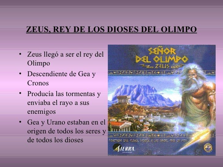 1 ZEUS, REY DE LOS DIOSES DEL OLIMPO• Zeus llegó a ser el rey del Olimpo• Descendiente de Gea y Cronos• Producía las tormentas y enviaba el rayo a sus enemigos• Gea y Urano estaban en el origen de todos los seres y de todos los dioses