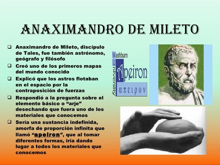 19.AnAximAndro de miletoq Anaximandro de Mileto, discípulo de Tales, fue también astrónomo, geógrafo y filósofoq Creó uno de los primeros mapas del mundo conocidoq Explicó que los astros flotaban en el espacio por la contraposición de fuerzasq Respondió a la pregunta sobre el elemento básico o “arje” desechando que fuera uno de los materiales que conocemosq Sería una sustancia indefinida, amorfa de proporción infinita que llamó “apeiron ”, que al tomar diferentes formas, iría dando lugar a todos los materiales que conocemos