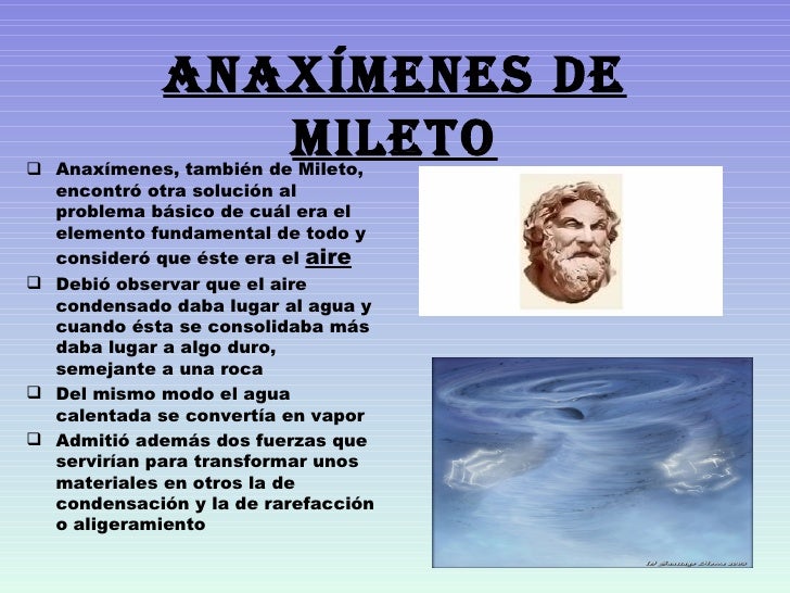 20. AnAxímenes de miletoq Anaxímenes, también de Mileto, encontró otra solución al problema básico de cuál era el elemento fundamental de todo y consideró que éste era el aireq Debió observar que el aire condensado daba lugar al agua y cuando ésta se consolidaba más daba lugar a algo duro, semejante a una rocaq Del mismo modo el agua calentada se convertía en vaporq Admitió además dos fuerzas que servirían para transformar unos materiales en otros la de condensación y la de rarefacción o aligeramiento