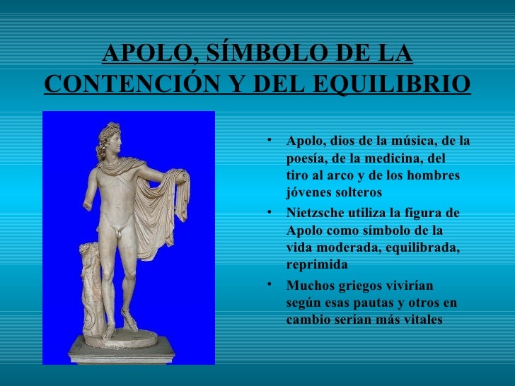4.APOLO, SÍMBOLO DE LA CONTENCIÓN Y DEL EQUILIBRIO • Apolo, dios de la música, de la poesía, de la medicina, del tiro al arco y de los hombres jóvenes solteros • Nietzsche utiliza la figura de Apolo como símbolo de la vida moderada, equilibrada, reprimida • Muchos griegos vivirían según esas pautas y otros en cambio serían más vitales