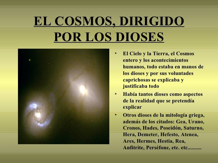 6. EL COSMOS, DIRIGIDO POR LOS DIOSES • El Cielo y la Tierra, el Cosmos entero y los acontecimientos humanos, todo estaba en manos de los dioses y por sus voluntades caprichosas se explicaba y justificaba todo • Había tantos dioses como aspectos de la realidad que se pretendía explicar • Otros dioses de la mitología griega, además de los citados: Gea, Urano, Cronos, Hades, Poseidón, Saturno, Hera, Demeter, Hefesto, Atenea, Ares, Hermes, Hestia, Rea, Anfitrite, Perséfone, etc. etc..........