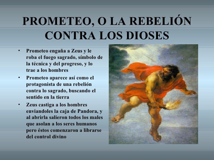 7. PROMETEO, O LA REBELIÓN CONTRA LOS DIOSES• Prometeo engaña a Zeus y le roba el fuego sagrado, símbolo de la técnica y del progreso, y lo trae a los hombres• Prometeo aparece así como el protagonista de una rebelión contra lo sagrado, buscando el sentido en la tierra• Zeus castiga a los hombres enviándoles la caja de Pandora, y al abrirla salieron todos los males que asolan a los seres humanos pero éstos comenzaron a librarse del control divino