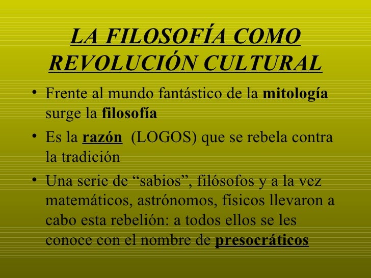 8. LA FILOSOFÍA COMO REVOLUCIÓN CULTURAL• Frente al mundo fantástico de la mitología surge la filosofía• Es la razón (LOGOS) que se rebela contra la tradición• Una serie de “sabios”, filósofos y a la vez matemáticos, astrónomos, físicos llevaron a cabo esta rebelión: a todos ellos se les conoce con el nombre de presocráticos